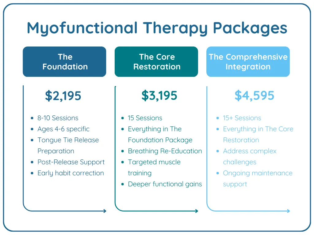 We offer treatment in carefully designed packages to provide consistent, progressive care. This approach ensures you or your child receive the dedicated support needed to achieve lasting improvements in oral function, breathing, and overall well-being. Our packages provide a clear roadmap to success. Find the perfect fit below.